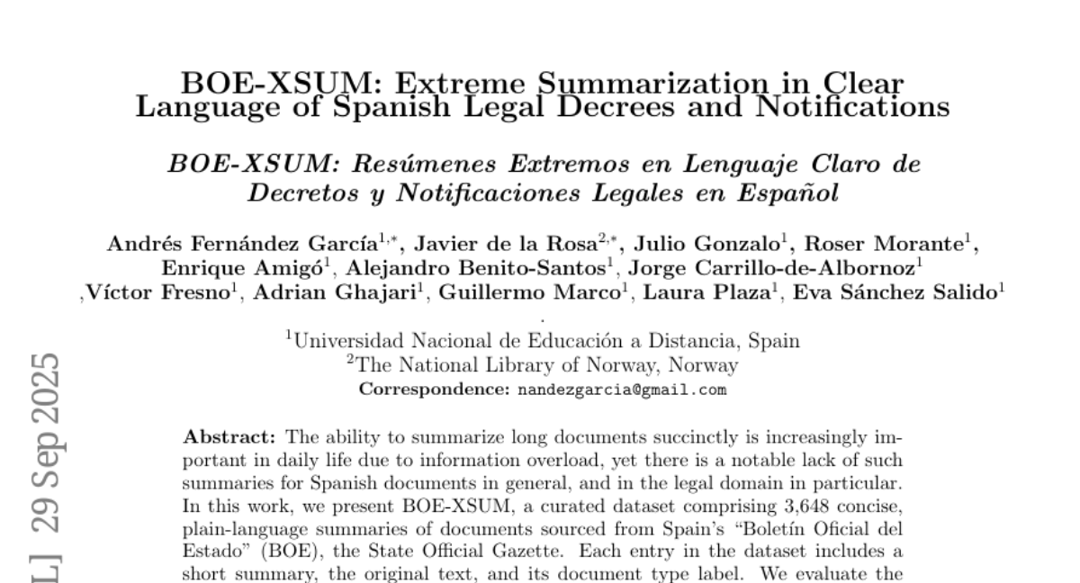 法律文档就像是古老的密码本,普通人看到那些繁复的条文,往往只能感叹"不知所云"。而在西班牙,这个问题尤其突出——每天都有大量法律公告发布在国家官方公报上,但这些文件对普通民众来说简直是天书。不过,由西班牙国立远程教育大学的安德烈斯·费尔南德斯·加西亚和挪威国家图书馆的哈维尔·德拉罗萨共同领导的研究团队,在2025年9月发表了一项突破性研究,创建了一个名为BOE-XSUM的数据集,专门用于将复杂的法律文档转换成普通人能理解的简洁摘要。
