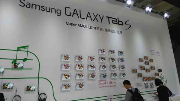 由GALAXY Tab S组成的“视觉之旅”展示墙也吸引了很多观众的目光。GALAXY Tab S有两个尺寸,分别是8.4英寸和10.5英寸。两种尺寸的GALAXY Tab S都搭载了Exynos 5420八核处理器,拥有800万与210万像素摄像头搭配,3GB内存,支持micro SD卡拓展容量。而且10.5英寸与8.4英寸分别内置了7900mAh和4900mAh大容量电池,官方称续航都可达11小时以上。而Super AMOLED炫丽屏也是GALAXY Tab S的最大亮点,其提供了丰富宽广的色域、质感深邃的画面对比度以及超快的屏幕响应速度,高调的呈现出了GALAXY Tab S一眼可辨的视觉体验优势。