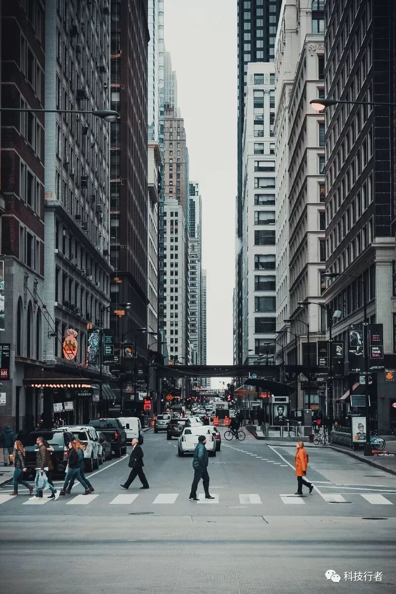 图:在摩天大楼高耸入云的市区内,人们正在穿越人行横道。