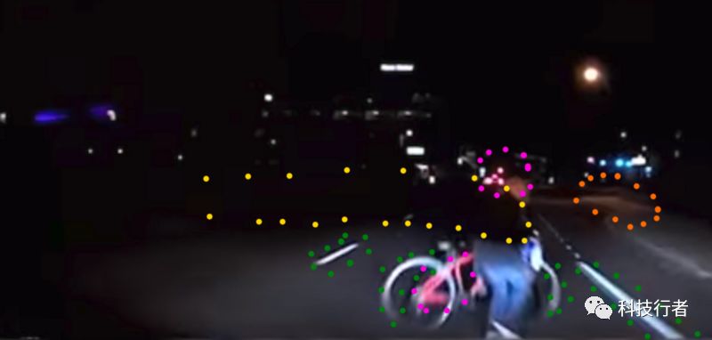 · 如果没有合适的三维信息(提供距离数据),自行车可能会被错误分类——请参阅上图中的绿色与粉红色标记注释。当我们人类看到整体图像时,会立即注意到这个人。因为自行车框架(用粉红色圆点标记)非常近似于汽车尾灯(同样用粉红色标记)。回到概率方面的讨论——在夜间行驶时,算法认为在车前遇到汽车尾灯或者自行车车架的具体可能性,分别是多少?其很可能曾经看到过多种不同形状的尾灯,但却很少见到自行车车架横在车前。因此,其倾向于将目标判断为尾灯。