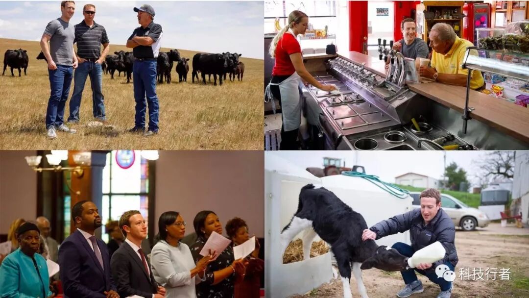 图:去年,扎克伯格的倾听之旅去了美国小镇。顺时针自左上:南达科他州皮埃蒙特的农场;爱荷华州威尔顿的糖果故事;威斯康辛州的布兰查维尔的养牛场;在南卡罗莱纳查尔斯顿的伊曼纽尔非洲卫理公会教堂做礼拜。
