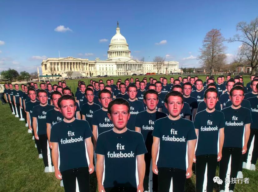 图:上周,活动人士在国会山的草坪上设置了100个百分百还原的扎克伯格纸板