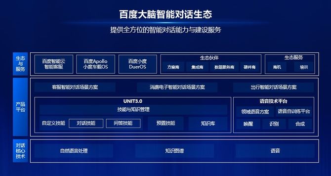 2017年7月,百度在AI开发者大会上发布对话系统定制平台UNIT,它搭载了业界领先的对话理解与对话管理技术,可以帮助开发者赋予产品智能对话的交互能力;2018年7月,UNIT推出的2.0版本,技术、功能与架构实现全面升级,为开发者提供更加易用、更加专业的对话系统定制能力。