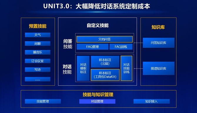 UNIT3.0也进一步升级了技能与知识管理能力,帮助开发者整合对话、问答技能,接入知识,通过单一接口一站式满足复杂的对话系统研发。技能管理实现多技能顺序可调,并共享全局记忆;对话管理具有在线与离线可编程对话管理框架,可适应多样化的业务场景;知识接入方面具备图谱知识库、关系数据库,HTTP服务全面支持接入。