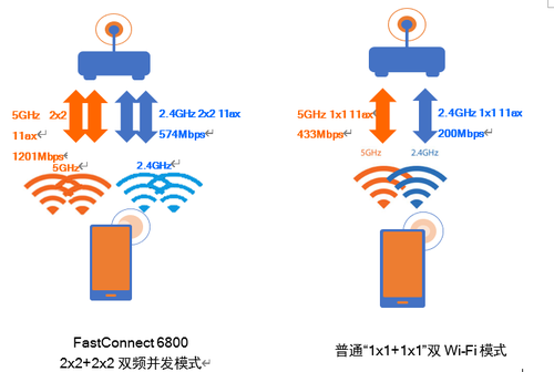 其中特别值得注意的是2×2+2×2双频并发这一特性。从去年开始,国内的头部OEM厂商比如OPPO、vivo和小米,相继推出了基于高通FastConnect 6200的双Wi-Fi的智能手机。在FastConnect 6800上,高通进一步推出2×2+2×2的双频并发Wi-Fi,可以在2.4GHz和5GHz频段,同时支持2×2的MIMO,并且是基于最高的1024QAM调制方式,一方面可以带来吞吐量的极大提升,最大的物理吞吐量可以达到1.8 Gbps。另一方面,因为两个链路同时工作,可以带来更低时延的网络效果。此外,由于能够兼顾2.4GHz和5GHz这两个网络频段,覆盖范围更大。这意味着我们通过搭载骁龙865的手机,可以在Wi-Fi 6网络条件下,同时使用2.4GHz和5GHz这两个网络频段,获得更高速率、更低时延、更广覆盖的Wi-Fi体验。