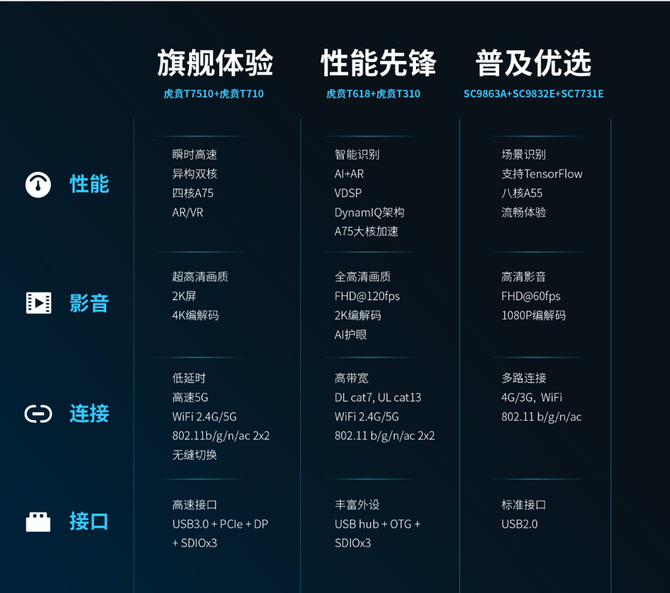虎贲T7510和虎贲T710致力打造旗舰体验,充分利用虎贲7系列提供的高性能、低时延和无缝切换的连接能力,基于展锐影像引擎整体方案Vivimagic的4K编解码技术,可提供更高画质、更清晰细腻的影像细节,结合音频处理技术,将带来无比精彩的影音体验。7系列提供了丰富的高速外设接口,多路数据并发Perfelink技术,提高数据的传输速率,为用户带来无感知的网络切换。异构双核架构NPU的采用,使AI算力大幅提升,为工业、商业、医疗、家居、教育等应用场景带来智能化升级。