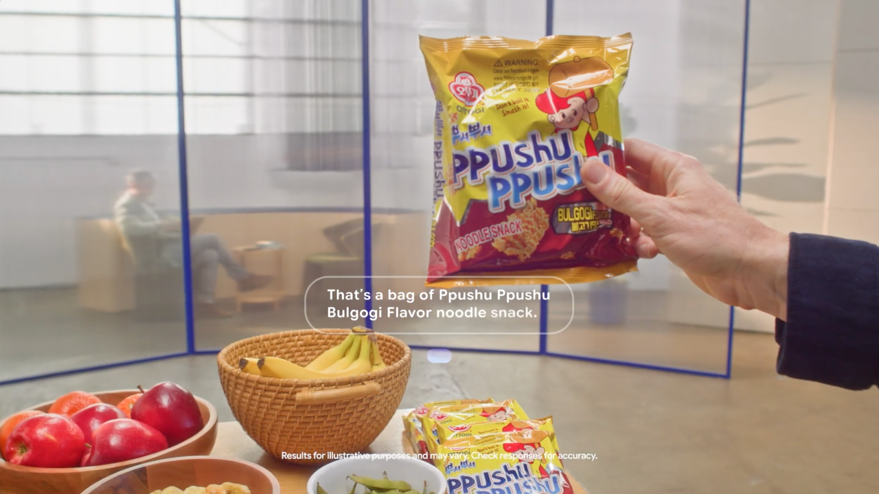 眼镜立刻回答:“这是一种韩国烤肉味干脆面,叫 PPUshU PPUshU,一般是捏碎了再撒调料包吃。”(这展示了AI眼镜可以调用知识库,从而给出更优质的答案。)