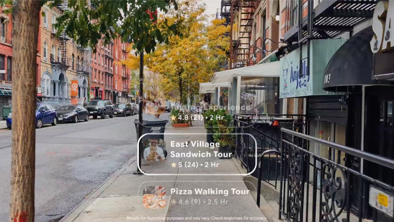 首先是与旅行体验平台 Get Your Guide 的合作。一位名叫 Rose 的“职业游客”戴着 AI 眼镜在纽约进行了一场美食之旅。她通过语音询问眼镜“附近有什么 Get Your Guide 的美食团?”,然后根据眼镜的指引找到集合点。在品尝美食和与团友互动时,她只需用语音说“拍张照片”,眼镜就能立即拍下合影。期间,当导游提出“热狗算不算三明治”这个经典问题时,Rose 直接向眼镜发问,Gemini 给出了一段关于面包知识的回答。