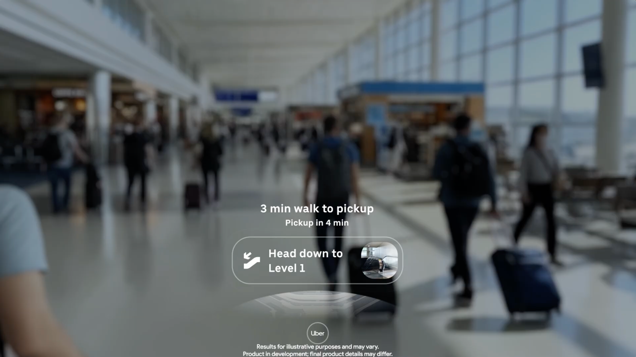 首先是信息提示。当用户刚下飞机,预订了一辆 Uber 后,眼镜的微型显示屏会立刻显示行程状态和预计到达时间,让用户无需低头看手机,可以专注于寻找出口。