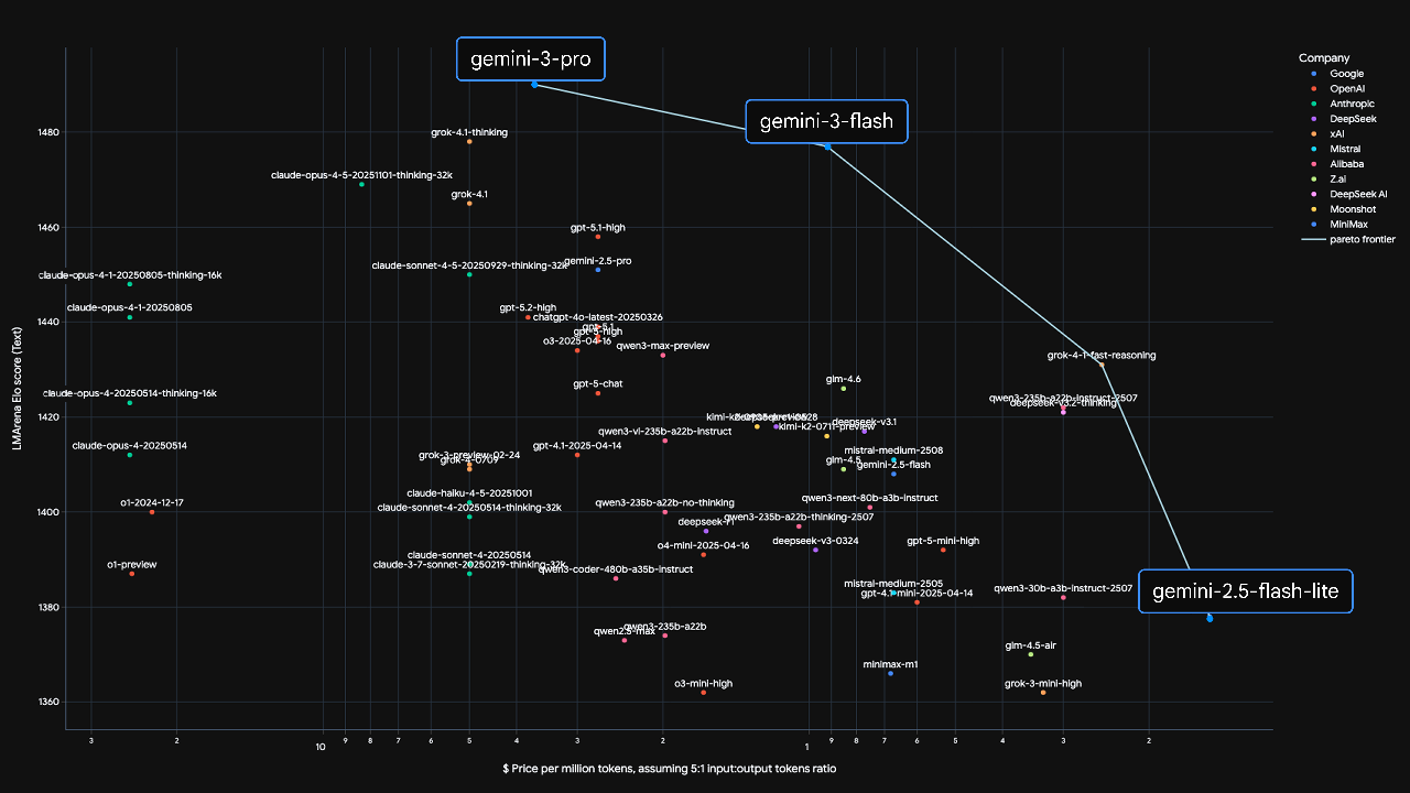 图:根据LMArena的 Elo 评分,Gemini 3 Flash 在性能与成本和速度的竞争上突破了帕累托的边界
