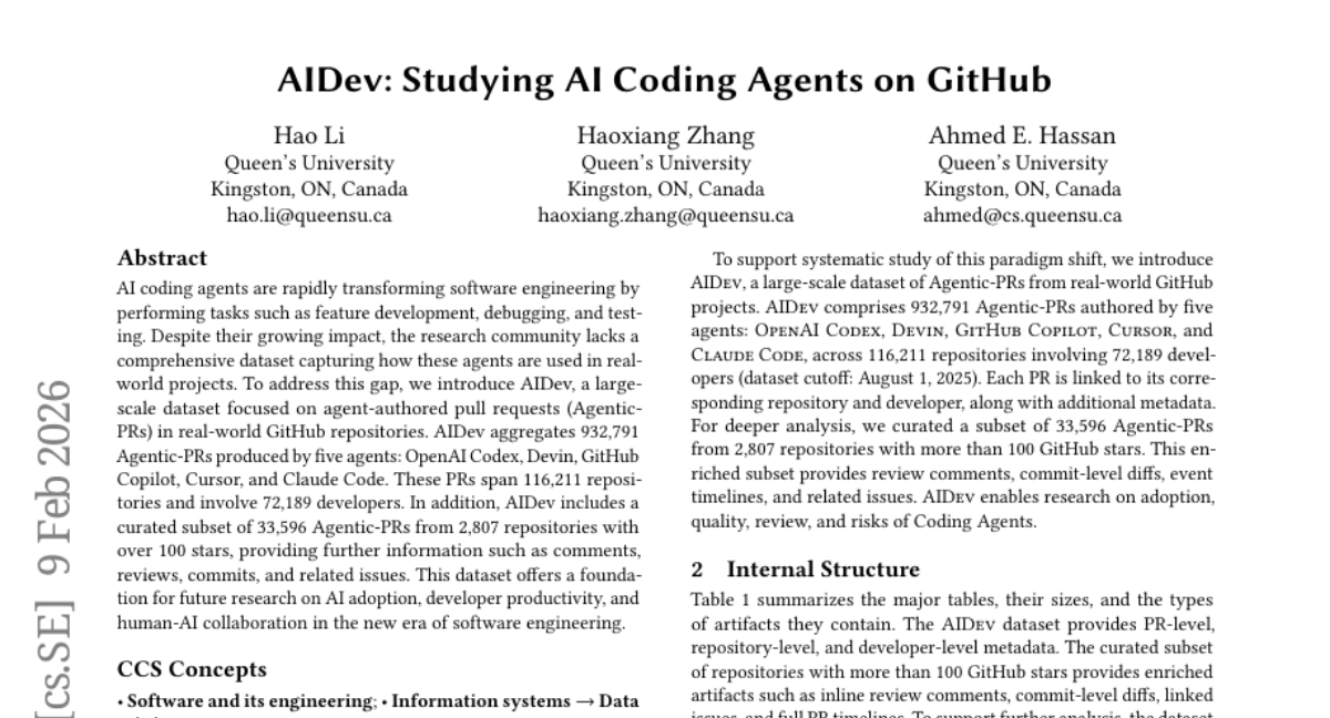 今天要和大家聊聊一个正在悄然改变程序员工作方式的有趣现象。女王大学的研究团队刚刚发布了一项名为AIDev的大规模研究,这项研究发表于2026年的软件仓库挖掘国际会议(MSR '26),详细记录了AI编程助手在GitHub这个全球最大代码托管平台上的真实表现。有兴趣深入了解的读者可以通过论文编号arXiv:2602.09185v1查询完整论文。